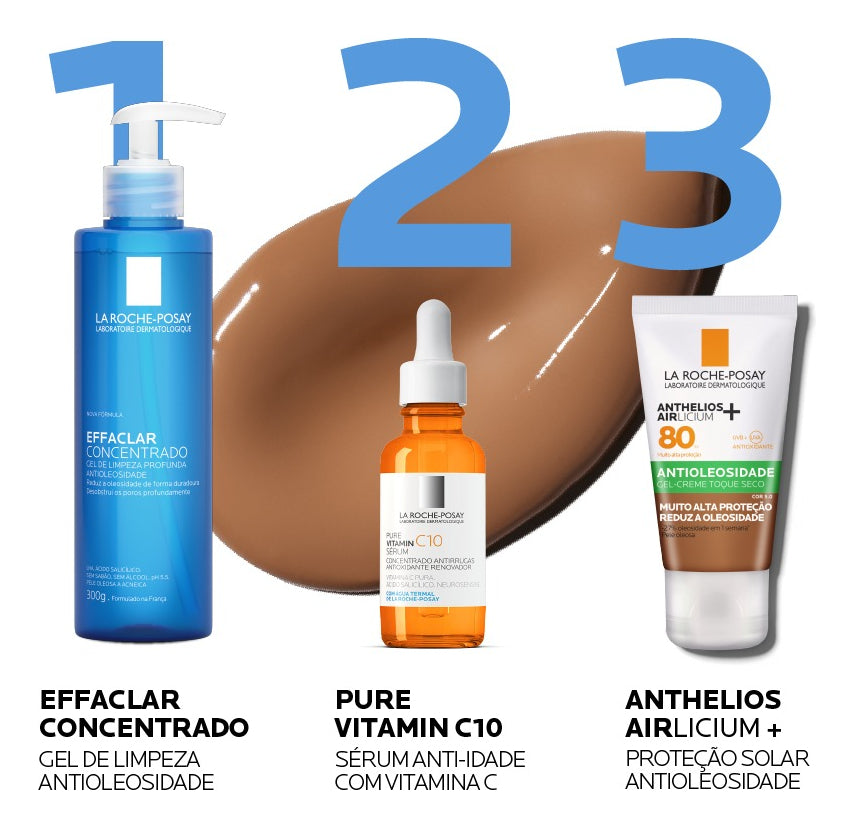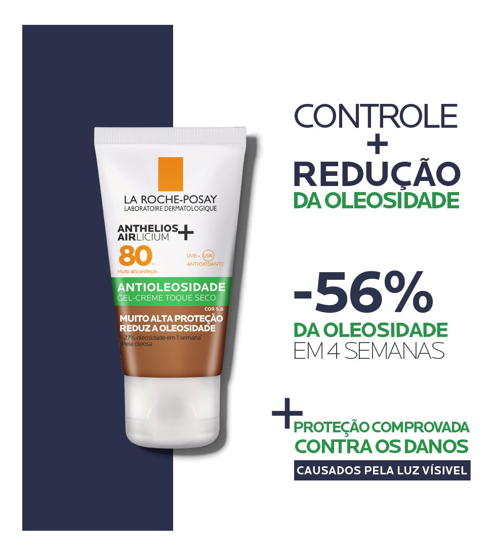 Protetor solar facial com cor. La Roche-Posay Anthelios Airlicium FPS80 protege e oferece um tratamento que reduz a oleosidade em 27% em apenas uma semana e 56% em um mês.