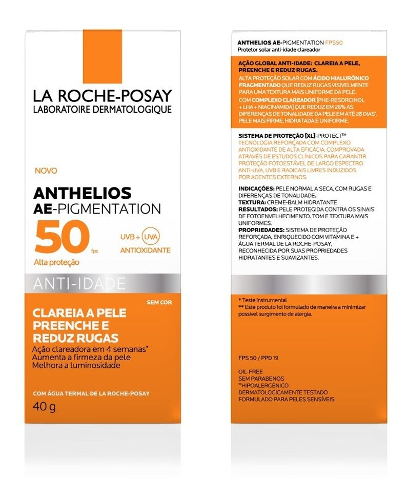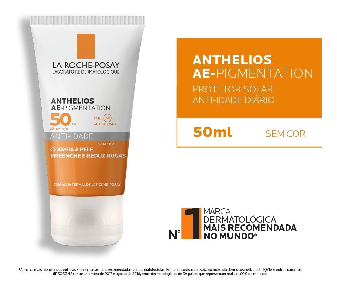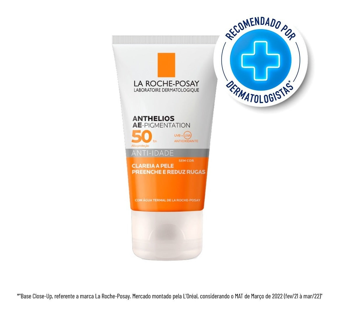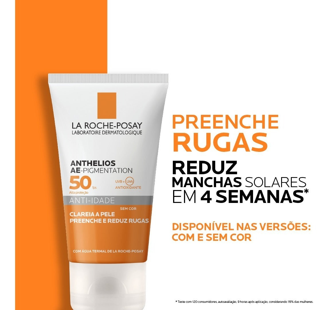 Protetor Solar La Roche-Posay Anthelios AE- Pigmentation preenche as rugas e linhas finas enquanto uniformiza o rosto. Além disso, sua fórmula possui alta resistência à água e não deixa a pele com o aspecto pegajoso ou oleoso ao longo do dia.