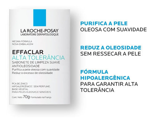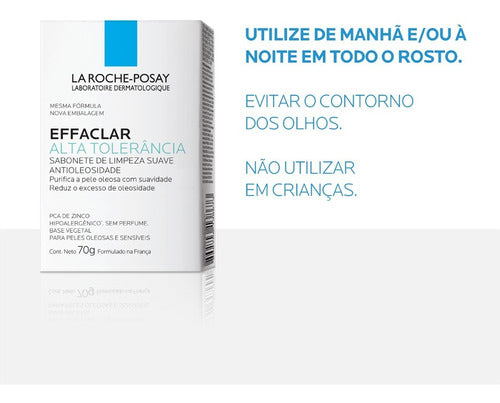 Sabonete La Roche-Posay Effaclar Alta Tolerância promove uma limpeza delicada, mas profunda, e remove toda a oleosidade em excesso, sem agredir a pele sensibilizada. Também auxilia no processo de renovação celular e mantém a hidratação da pele para evitar a sensação de repuxamento.
