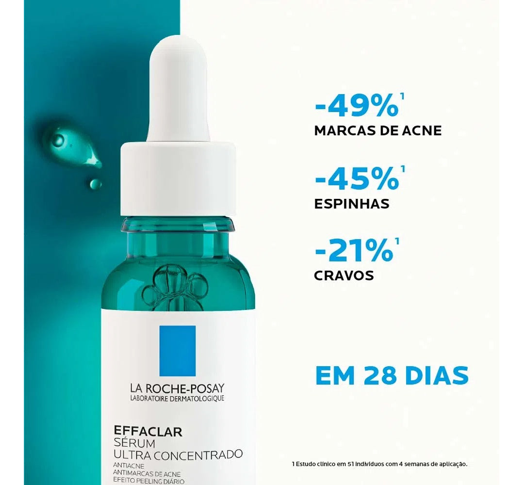Sérum anti-acne. La Roche-Posay Effaclar Ultra Concentrado promove efeito peeling diário, foi especialmente desenvolvido para tratar e prevenir a acne, poros visíveis e marcas de acne no rosto.